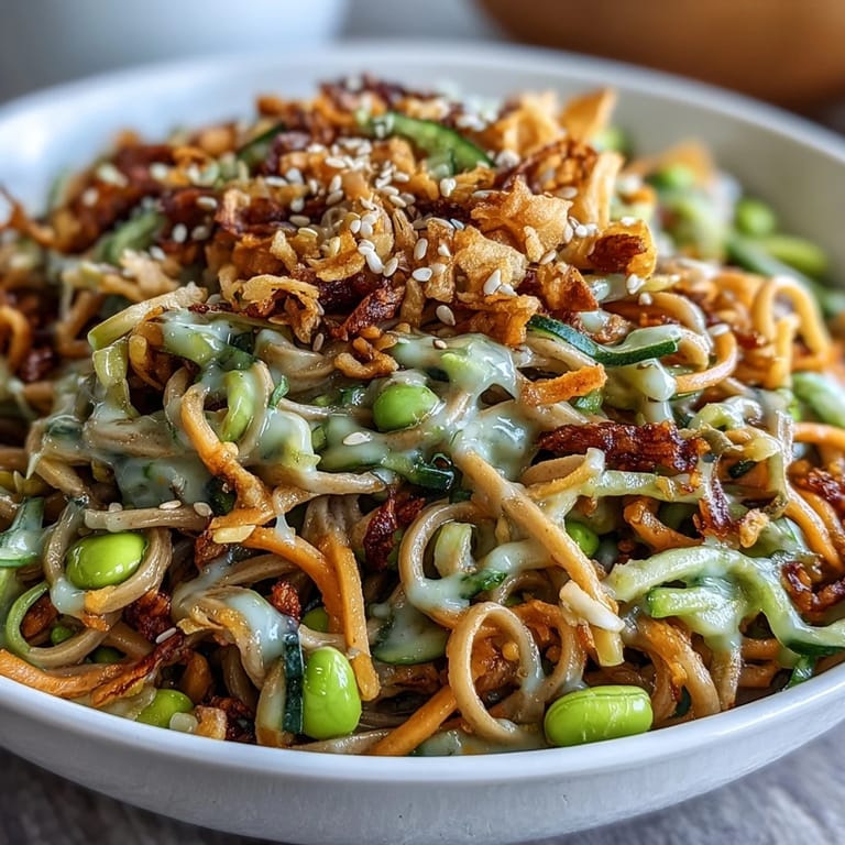 The dressing is really where this whole bowl comes alive, and it's worth taking a minute to understand why each ingredient matters. That tahini adds creaminess and depth without any dairy, the ginger gives you a subtle heat that creeps up on you, and the balance of soy, vinegar, and sesame oil creates something that tastes expensive and complicated but isn't. I've learned that whisking it by hand rather than blending it somehow keeps it lighter and more integrated—less like a sauce and more like the noodles just naturally taste this way.